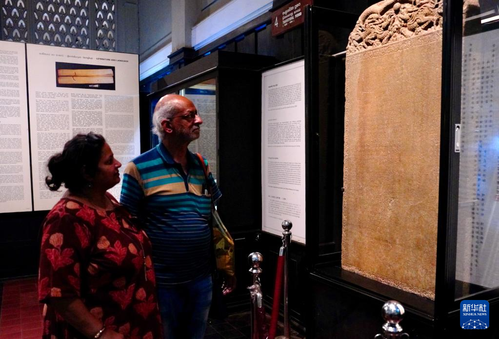 4月17日,鄭和遺存《布施錫蘭山佛寺碑》(中)在斯里蘭卡科倫坡國家博物館主展廳展出。