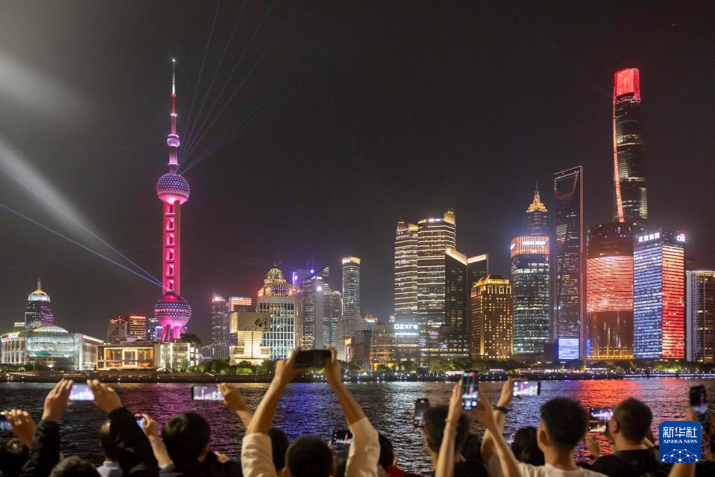 4月17日,人們在上海外灘拍攝對岸陸家嘴慶祝浦東開發開放35周年光影秀。