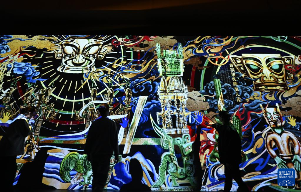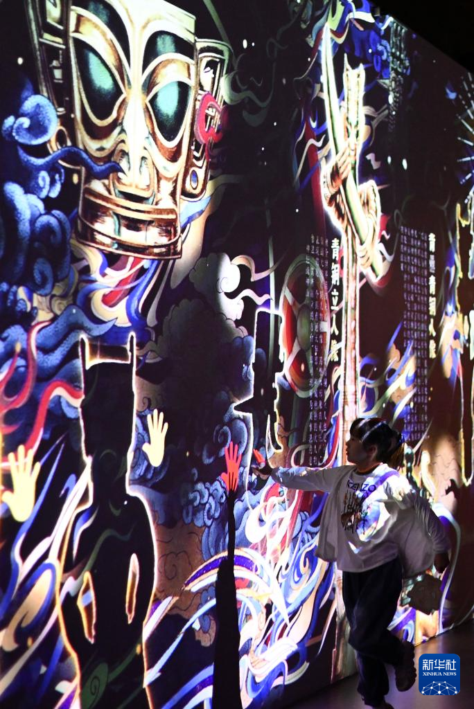 4月22日,觀眾在“一醒驚天下·三星堆沉浸式光影藝術展”體驗一款互動游戲。