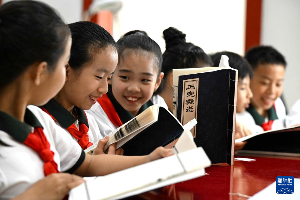 4月21日,石家莊市實驗小學學生在石家莊市圖書館古籍修復室翻閱現代線裝書并交流學習體會。