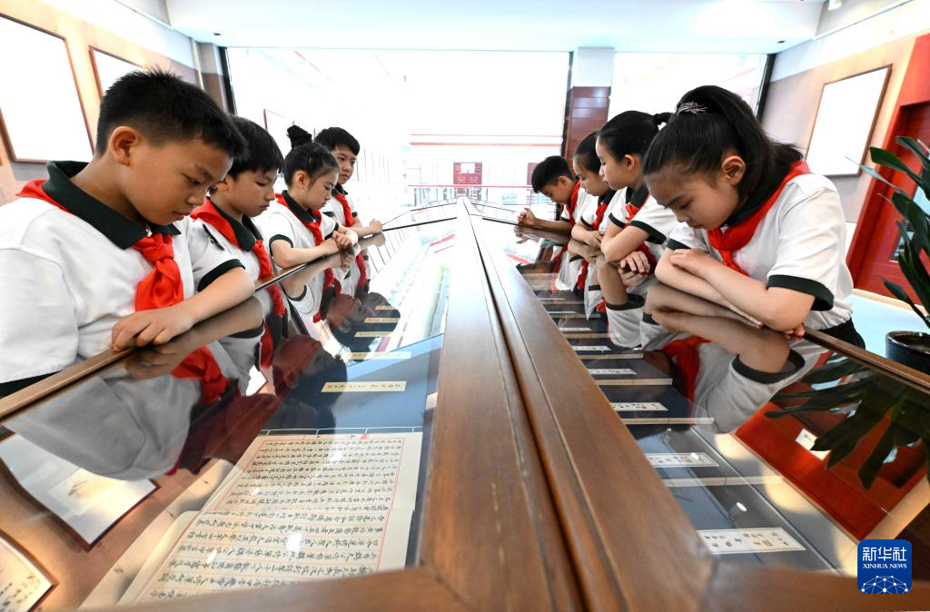 4月21日,石家莊市實驗小學學生在石家莊市圖書館參觀手抄中國名著展覽。