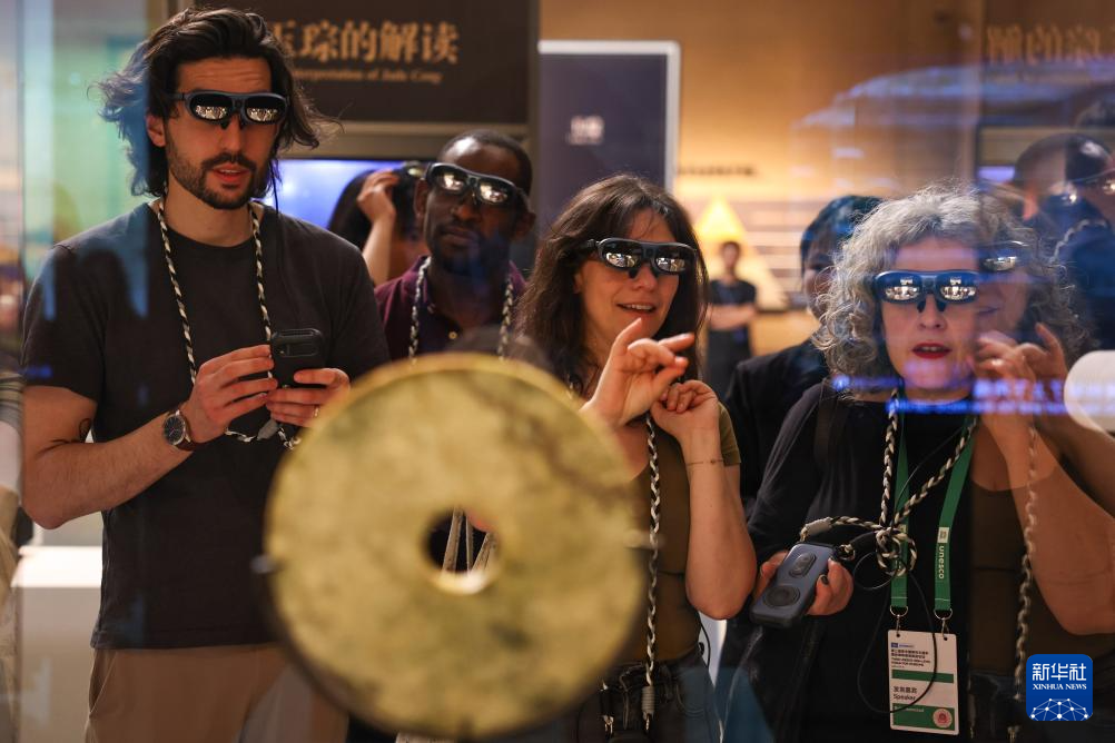 4月23日,參加論壇的嘉賓使用AR(增強現實)眼鏡參觀良渚博物院展品。