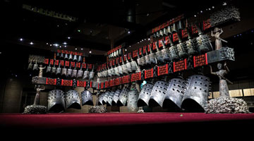 4月25日,工作人員在體驗一件可以互動游戲的藝術作品《泡泡平衡》。