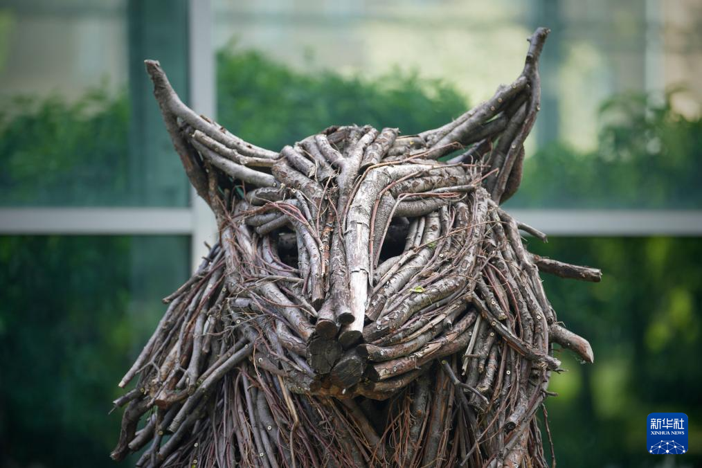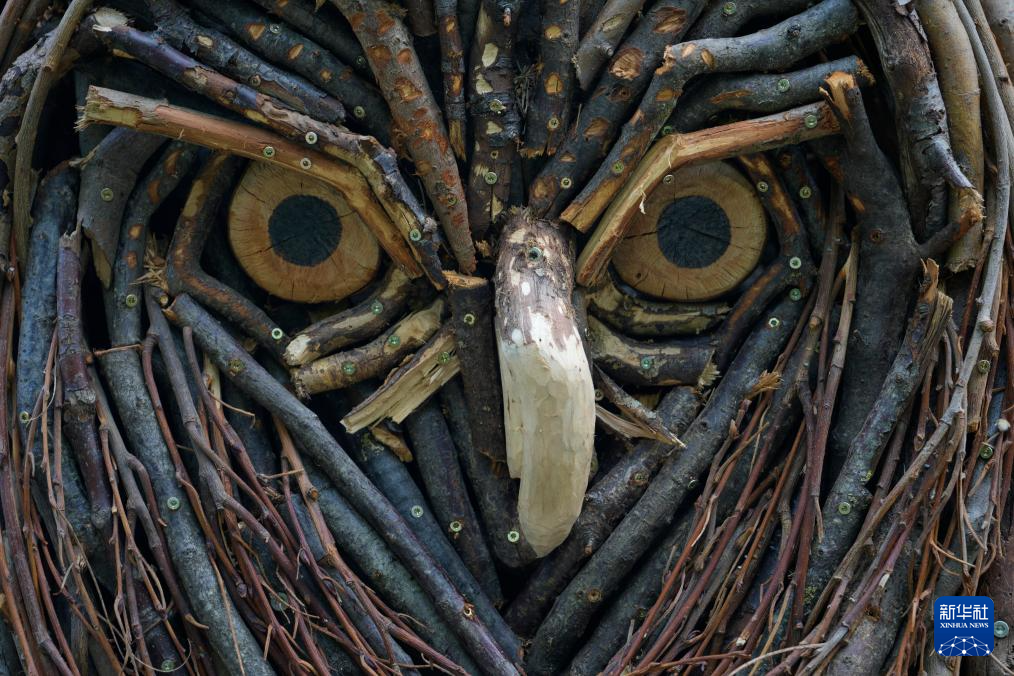 這是5月6日在波蘭首都華沙拍攝的貓頭鷹樹枝雕塑。