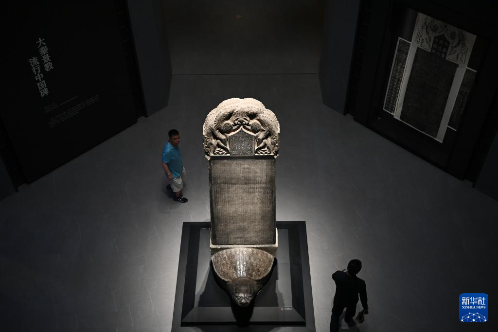5月12日,游客在改擴建后的西安碑林博物館北區場館參觀石碑。