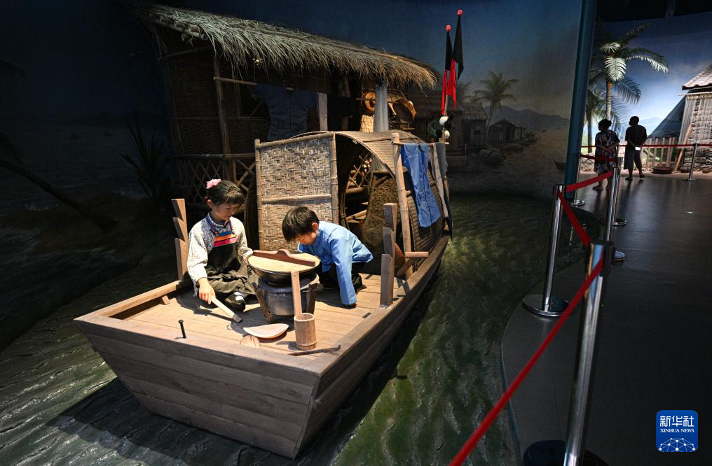 5月13日在海南疍家博物館拍攝的展示疍家人生活在住家船上的場景。早期疍家人大多居住在船上,每戶一般有一至兩艘船用于作業和居住。