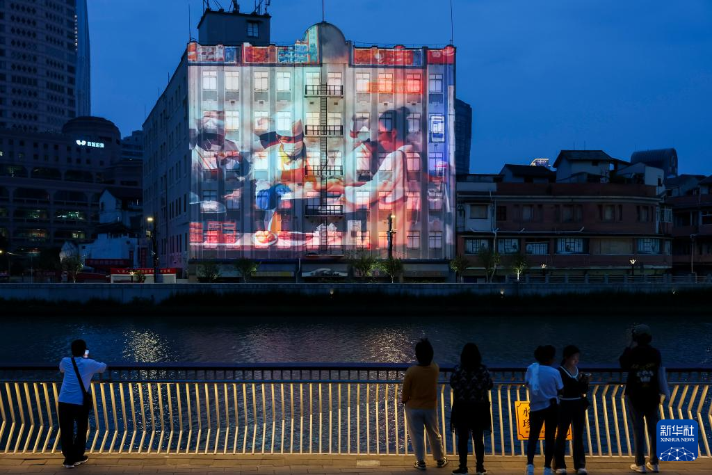當日,“上海光影美術館”首展在上海市靜安區蘇河灣親水平臺亮相,展覽打破傳統美術館的空間限制,讓市民在城市空間中欣賞數字化藝術作品。