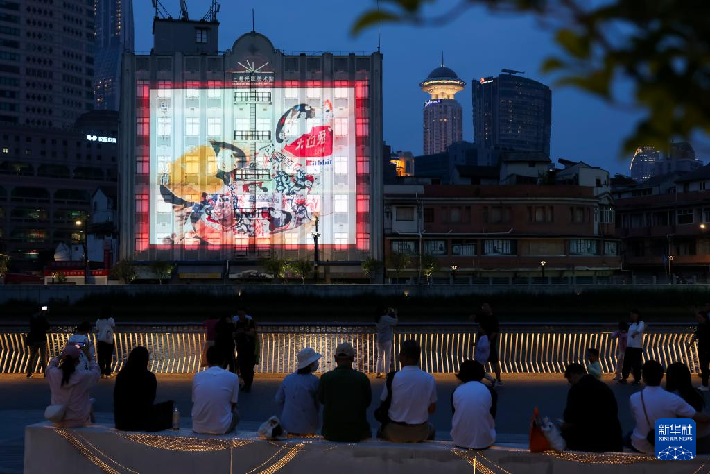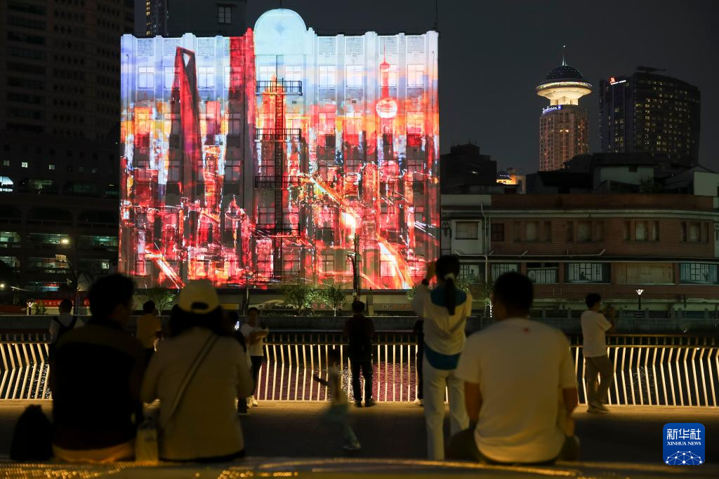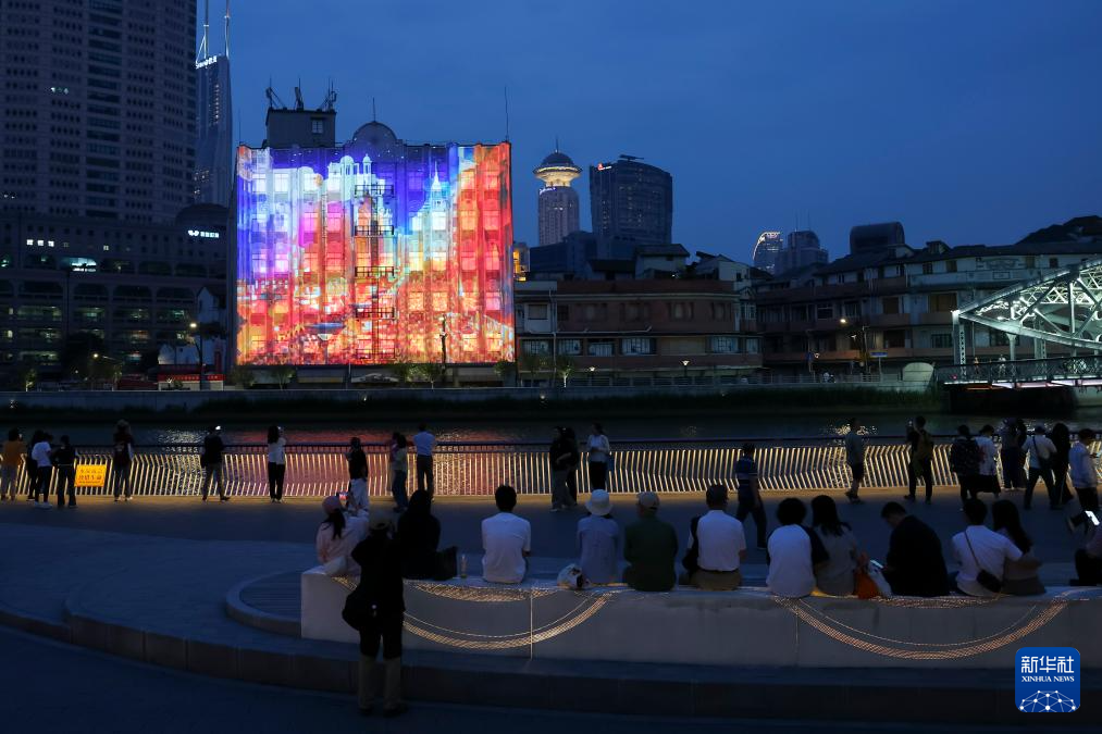 5月31日,人們在上海市靜安區蘇河灣親水平臺欣賞光影秀。