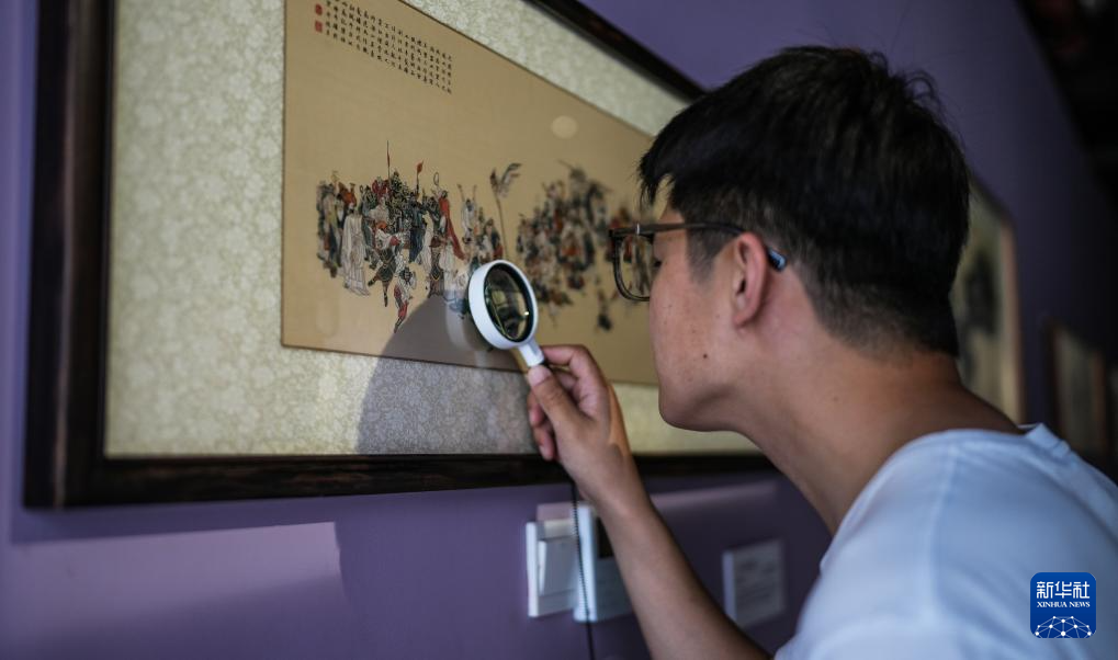 6月6日,在東臺西溪天仙緣景區內的東臺發繡展示館,游客用放大鏡觀賞發繡作品《一百零八將》。