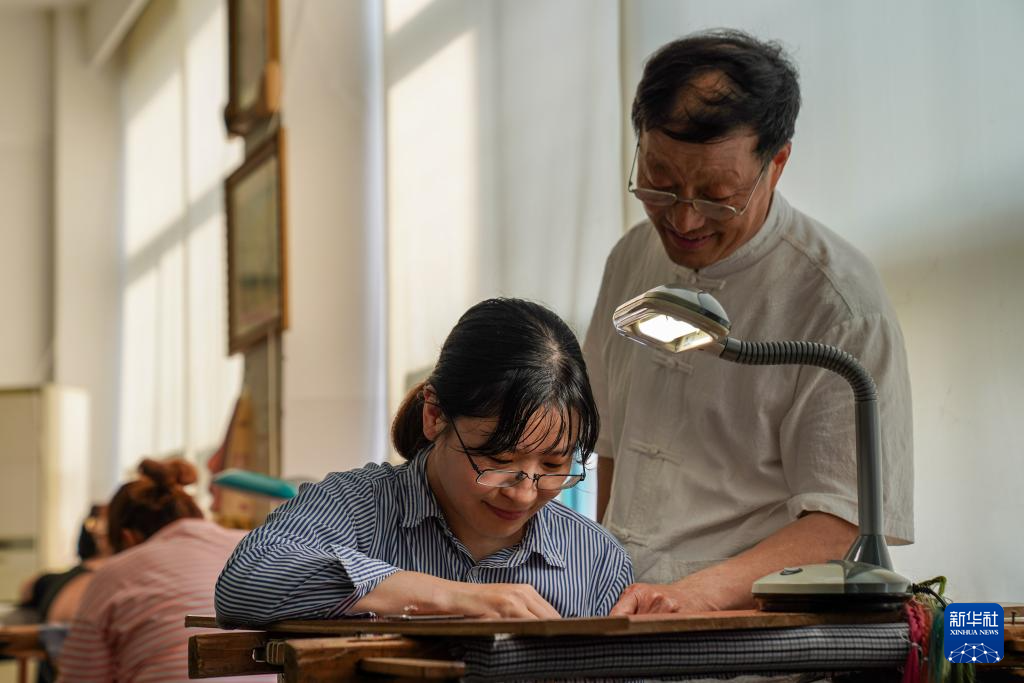 6月6日,在東臺嘉麗發繡廠,東臺發繡傳承人陳伯余指導徒弟繡制發繡作品。