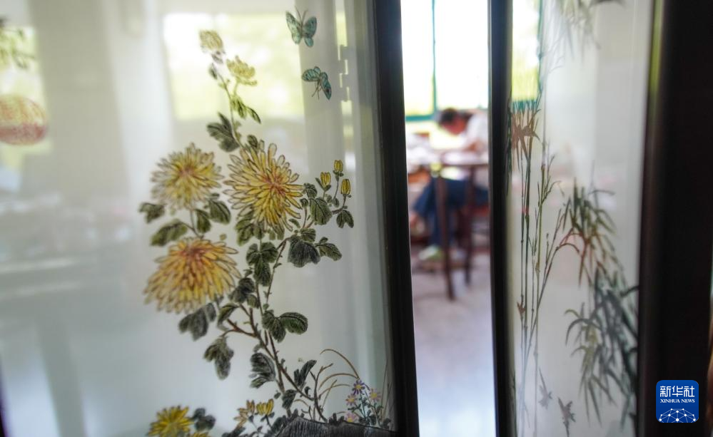 6月6日,在東臺嘉麗發繡廠,東臺發繡傳承人陳伯余指導徒弟裝裱一幅雙面發繡作品。