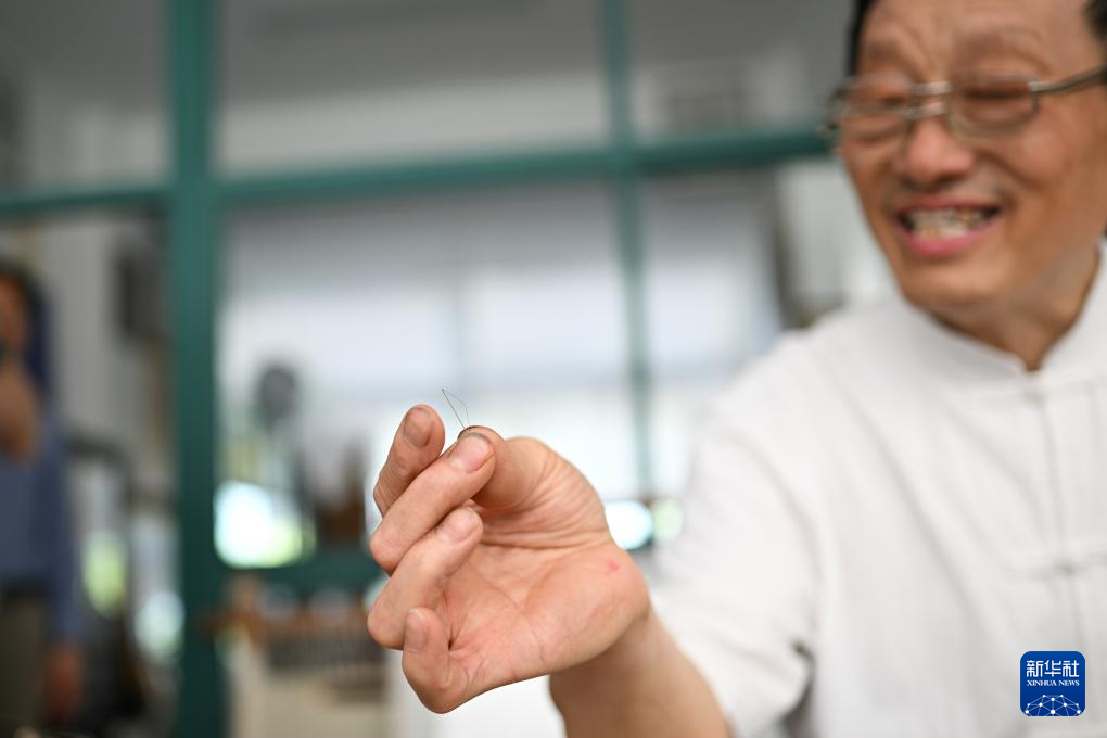 6月6日,在東臺嘉麗發繡廠,東臺發繡傳承人陳伯余展示發繡所用的“12號針”。