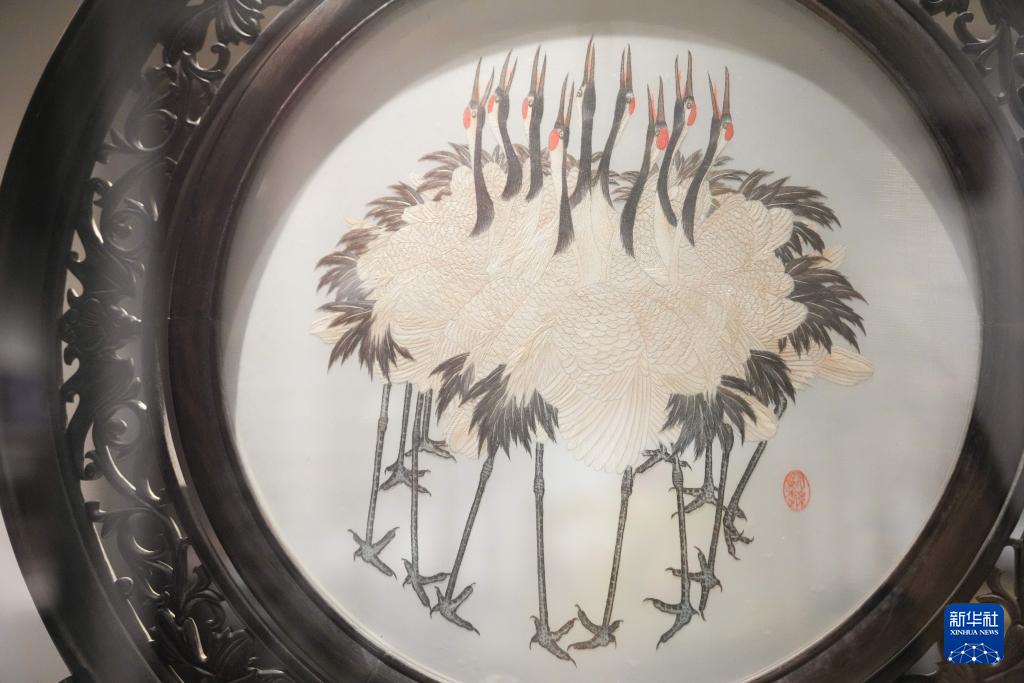 6月6日在東臺市博物館拍攝的以丹頂鶴為題材的發繡作品。