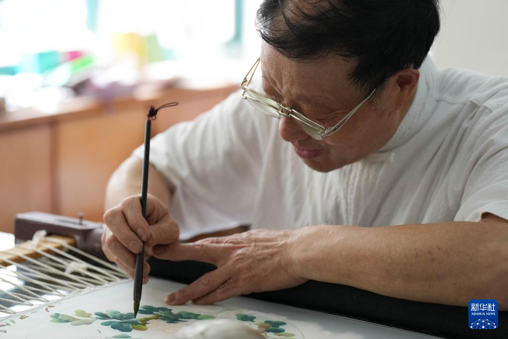 6月6日,在東臺嘉麗發繡廠,東臺發繡傳承人陳伯余用顏料勾畫樣稿。這一環節是發繡的前置,稱為“勾繃落樣”。