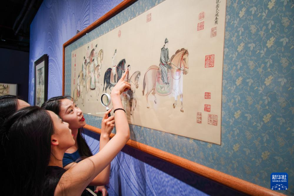 6月6日,在東臺西溪天仙緣景區內的東臺發繡展示館,游客觀賞、討論發繡作品《虢國夫人游春圖》。