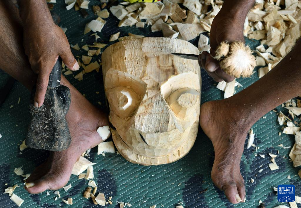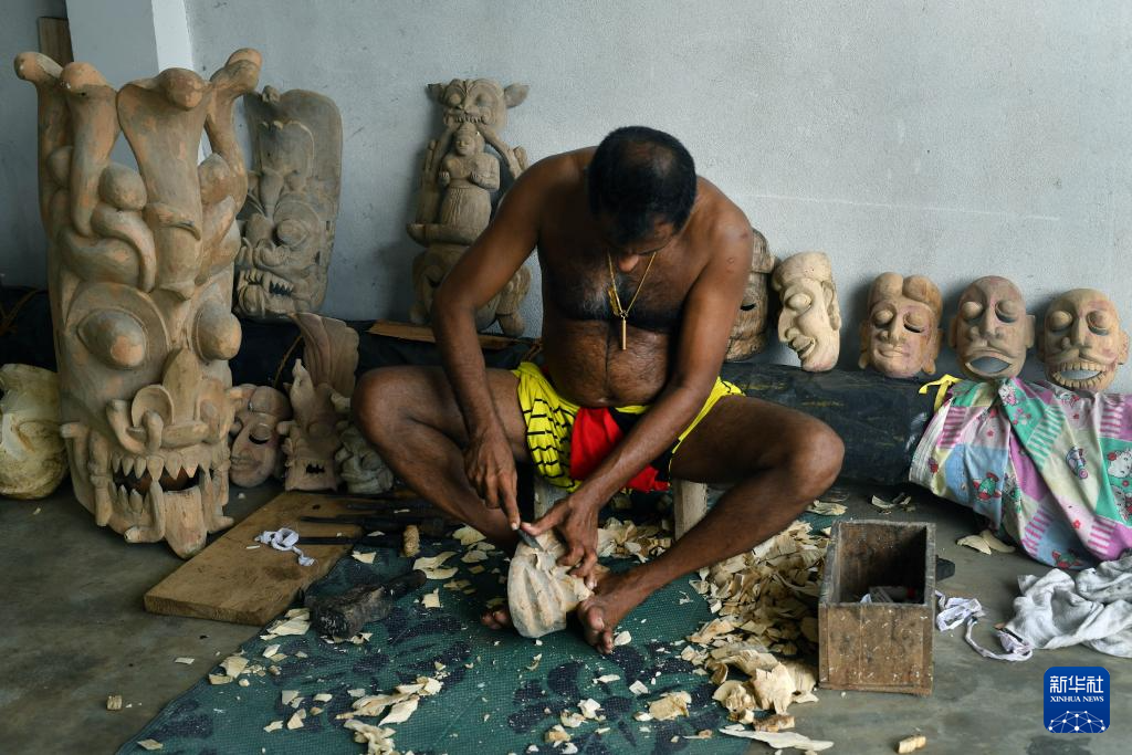 6月25日,一名手工藝者在斯里蘭卡戈納波拉村制作斯里蘭卡傳統面具。