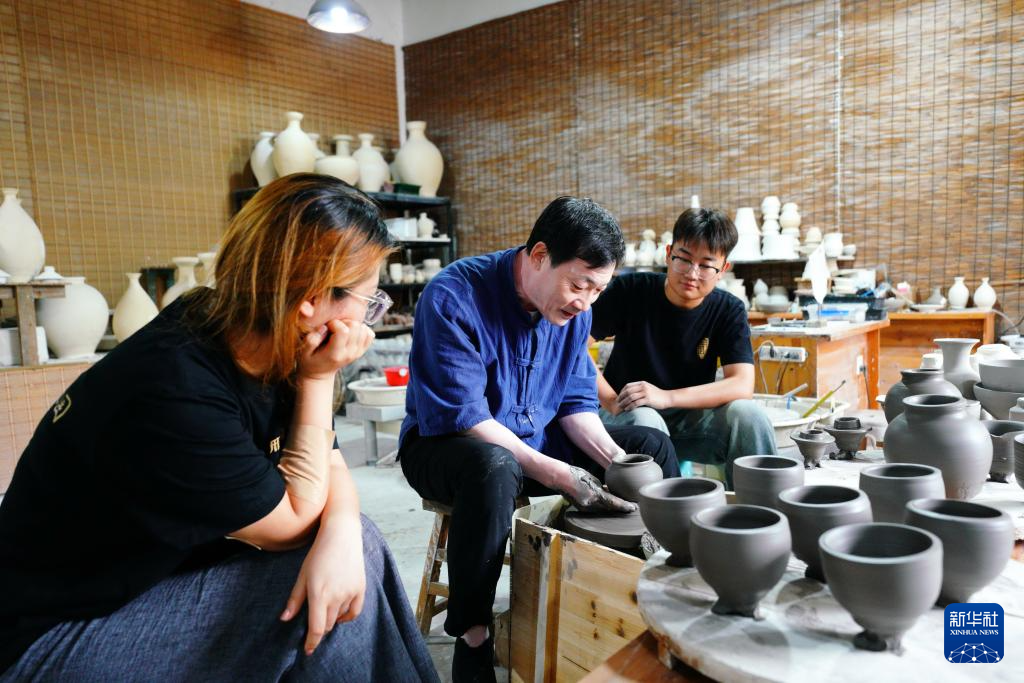 6月28日,張志忠(中)在給學生講解瓷器制作技巧。