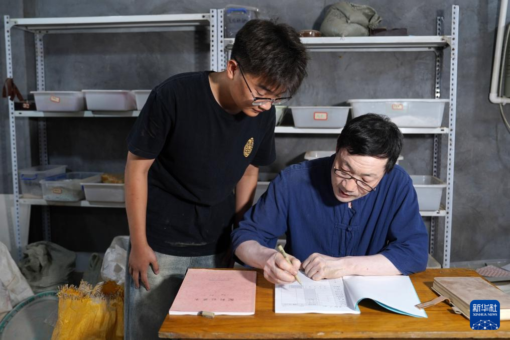 6月28日,張志忠(右)和學生研究記錄燒制白瓷的原料配方。