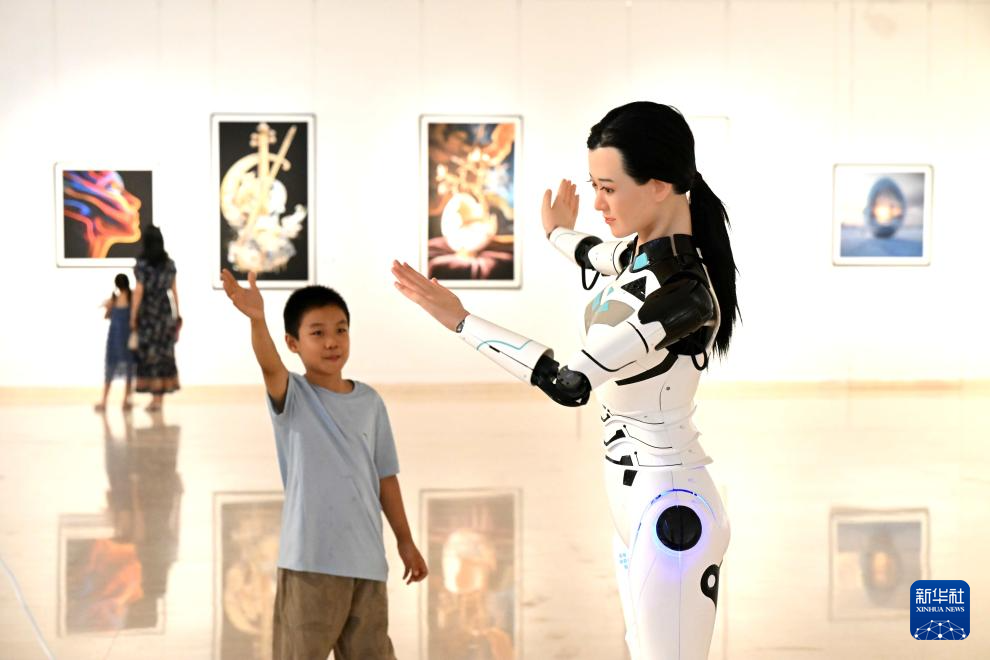 7月14日,小朋友在河北省石家莊市美術館AI藝術畫展體驗區與機器人互動。