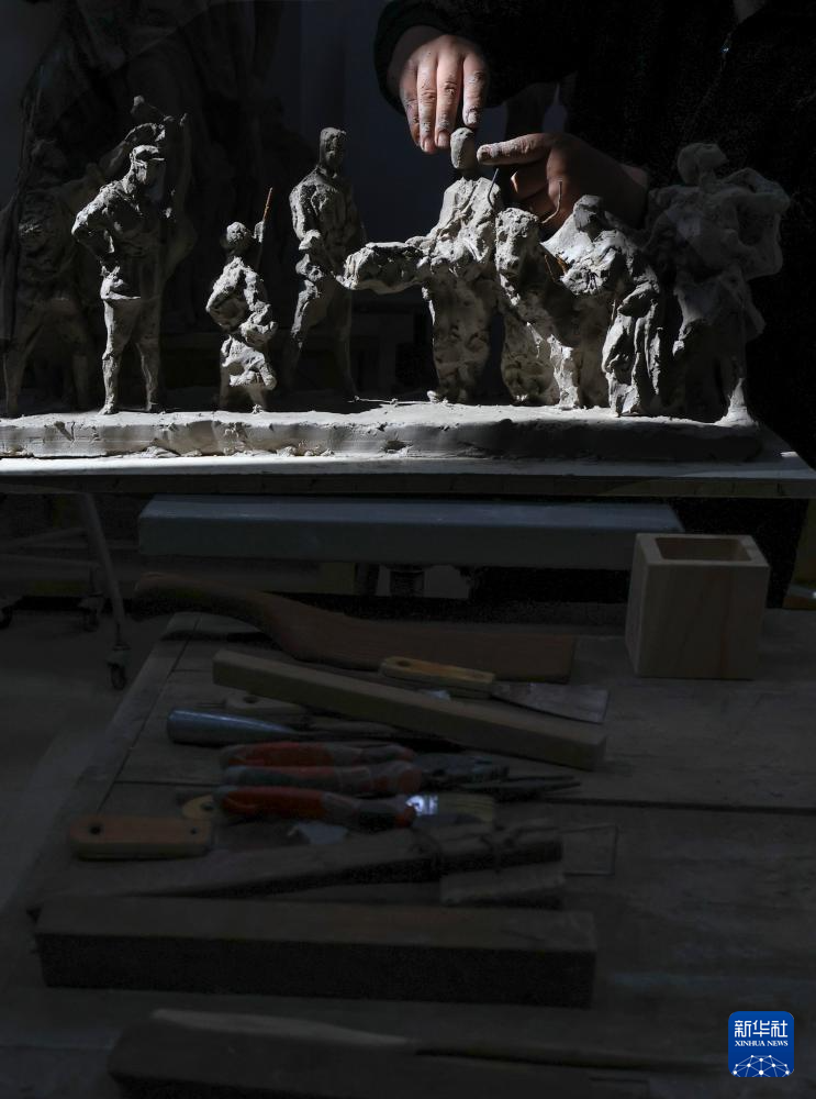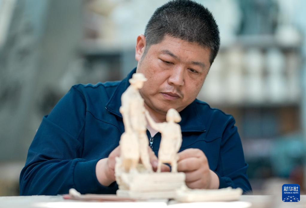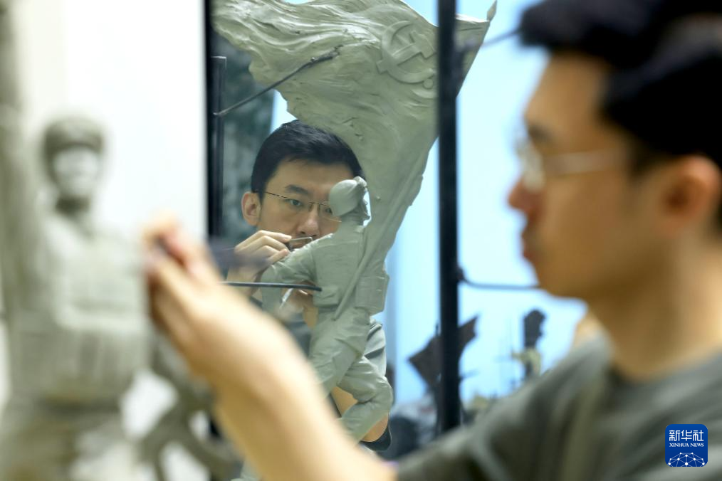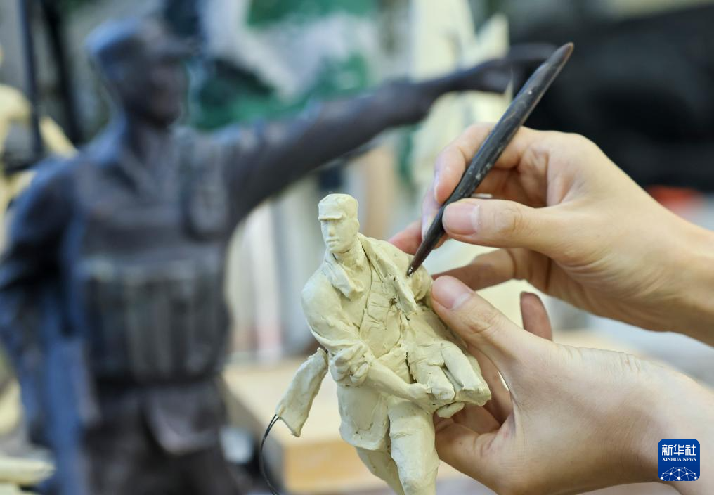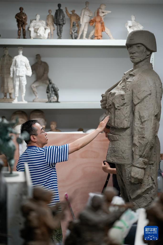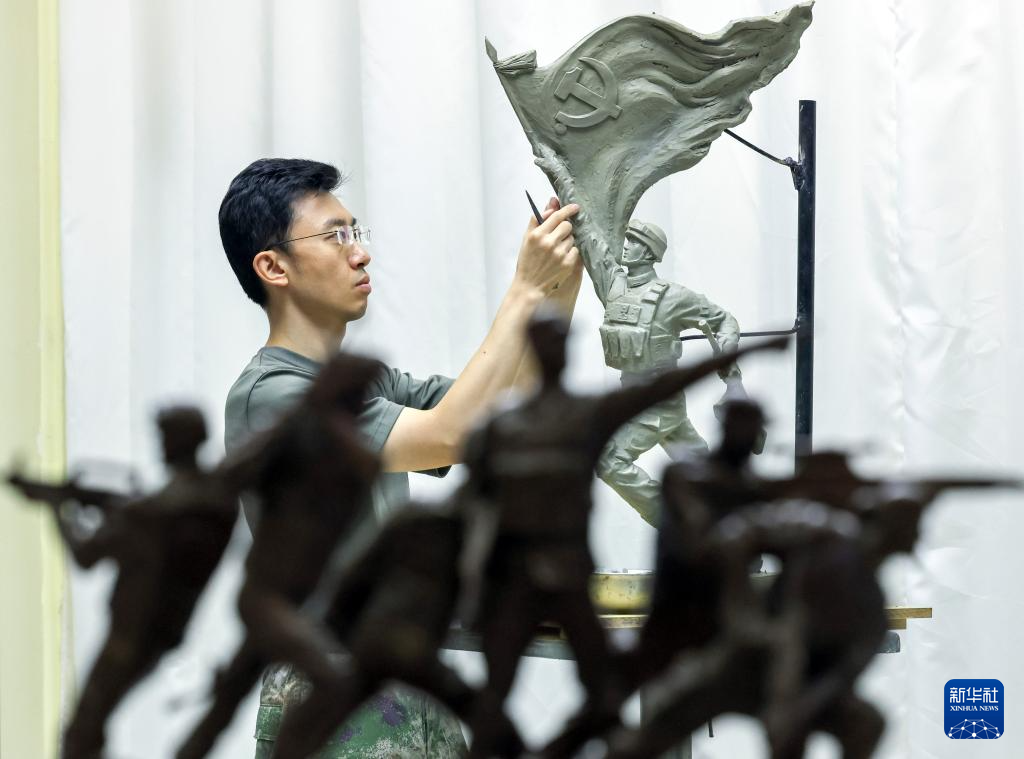 7月17日,解放軍文工團雕塑創作員郎鉞在進行雕塑創作。