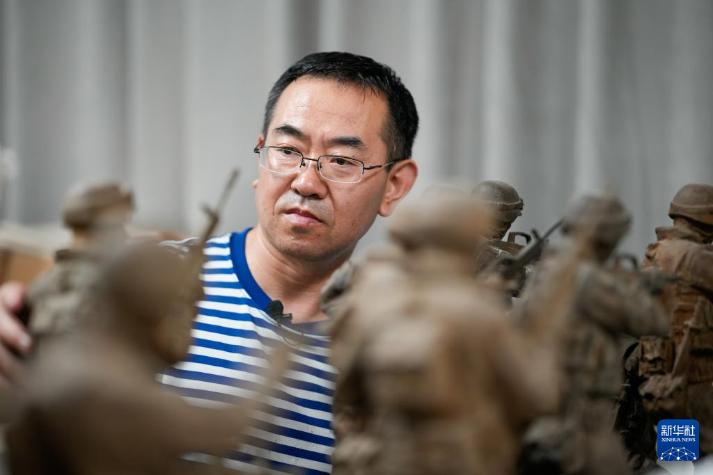 7月24日,國防大學軍事文化學院副教授王樹山在查看自己的雕塑作品。
