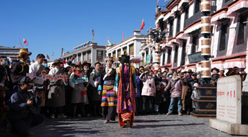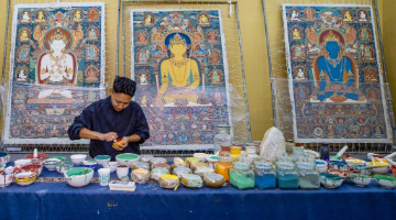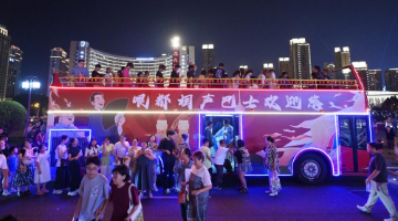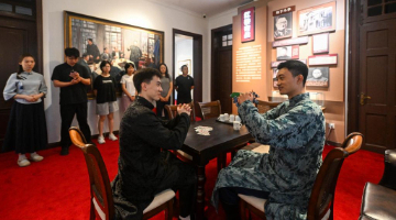8月18日,游客在三福古典家具有限公司文創產品展示臺試戴木制手串。