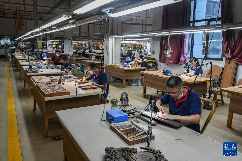 8月18日,工人在莆田仙游三福古典家具有限公司雕刻工藝美術品。