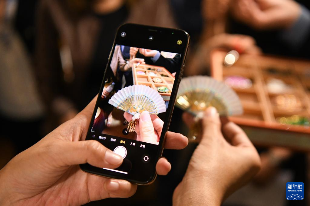 8月22日,在瑞士伯爾尼中國文化中心,嘉賓在 “安善萃錦——中式生活美學展”上拍攝精美飾品。