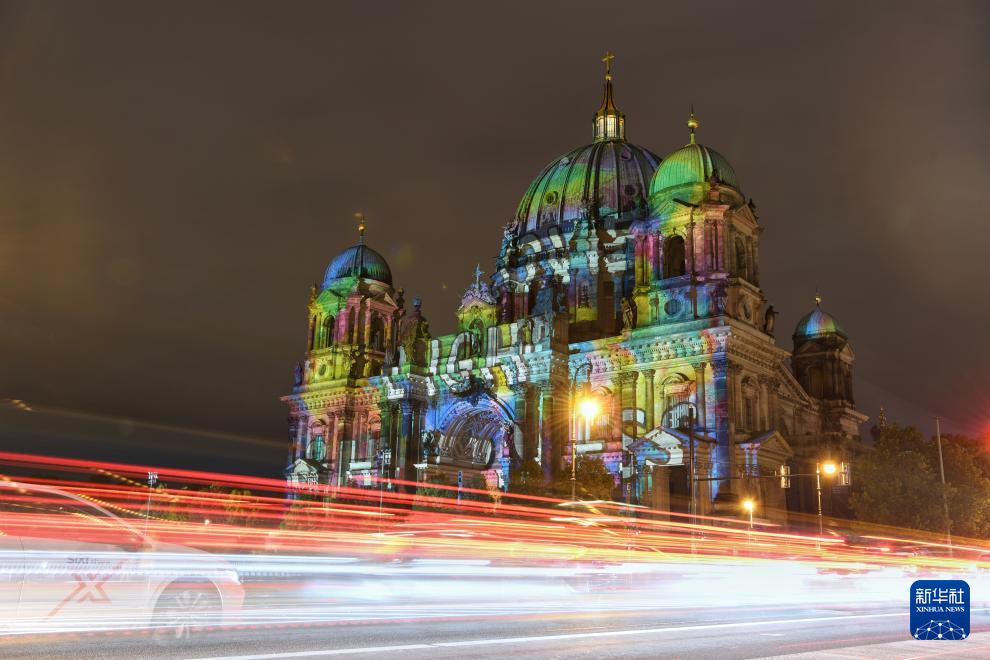 10月9日,德國柏林大教堂被燈光點亮(長時間曝光)。