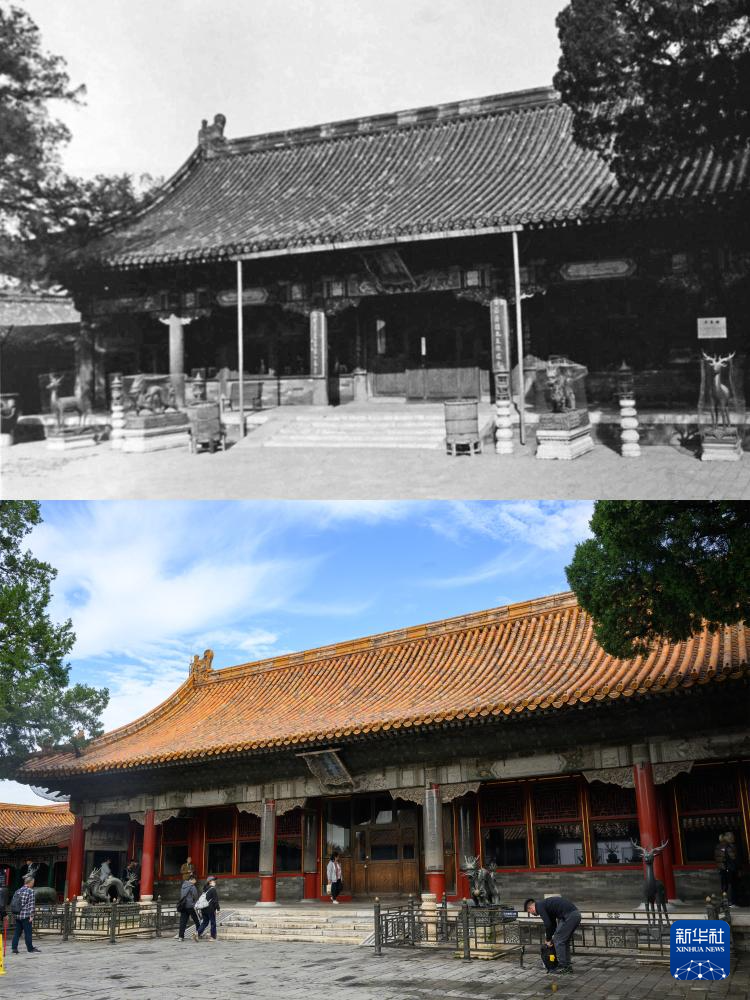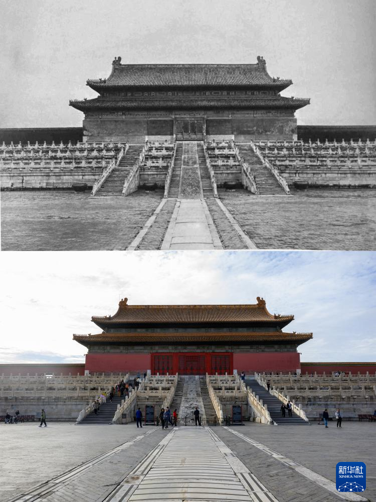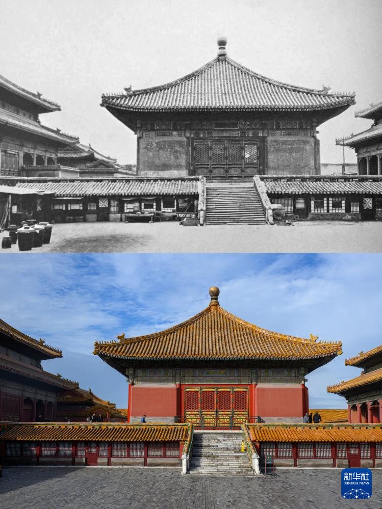 拼版照片:上圖為20世紀初拍攝的中和殿(故宮博物院供圖);下圖為2025年10月10日拍攝的中和殿(新華社記者金良快攝)。