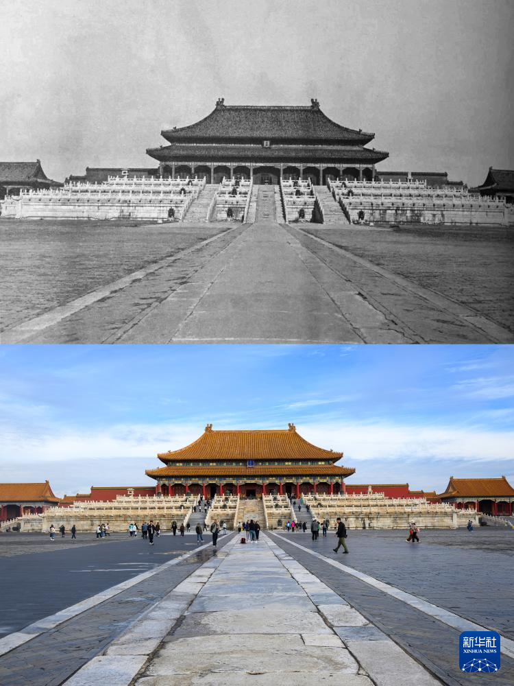 拼版照片:上圖為20世紀初拍攝的太和殿(故宮博物院供圖);下圖為2025年10月10日拍攝的太和殿(新華社記者金良快攝)。