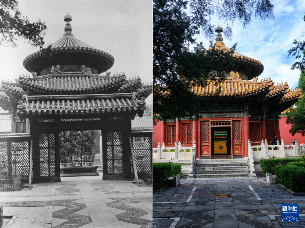 拼版照片:上圖為20世紀20年代拍攝的欽安殿(故宮博物院供圖);下圖為2025年10月10日拍攝的欽安殿(新華社記者金良快攝)。