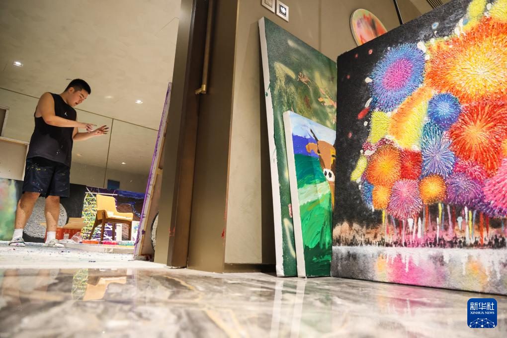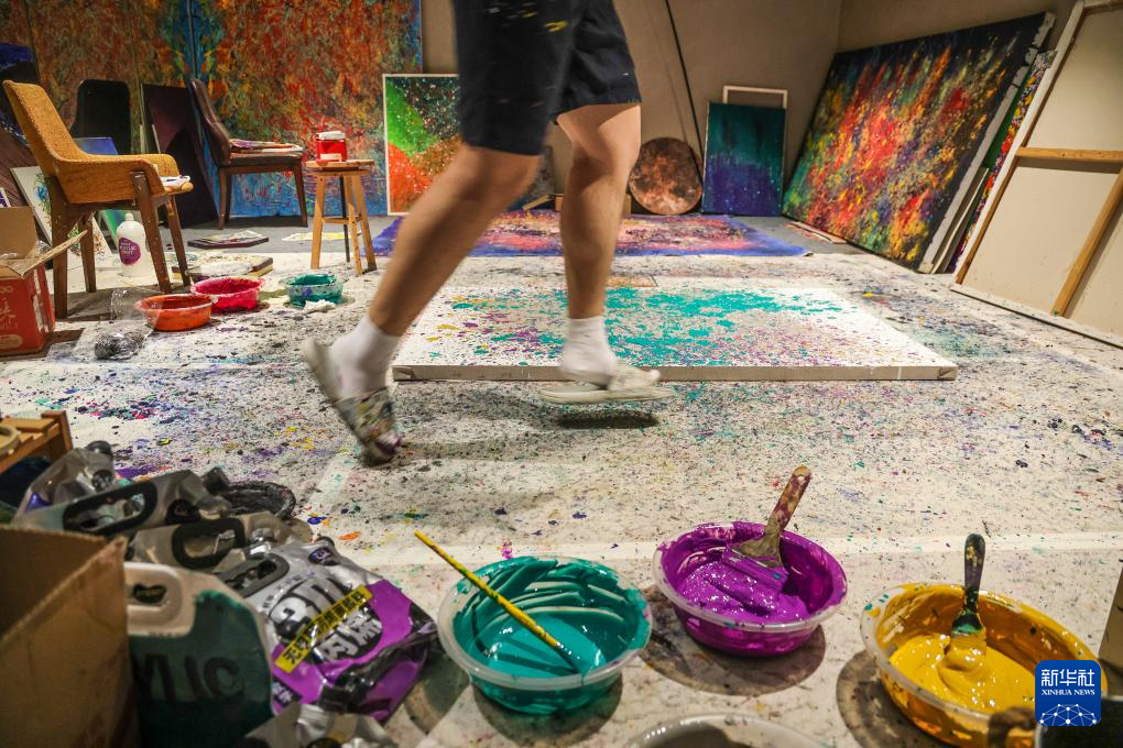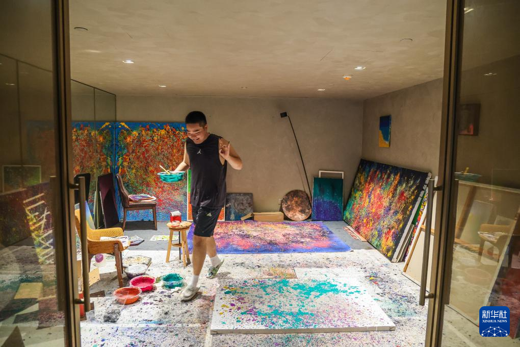 8月8日,王劍書在北京的畫室創作滴灑畫時,開心得跳起來。