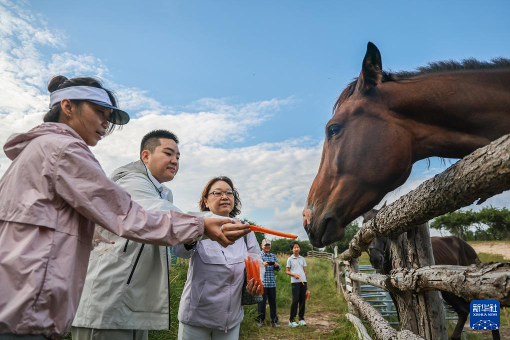 8月17日,王劍書在河北承德御道口草原體驗喂動物。