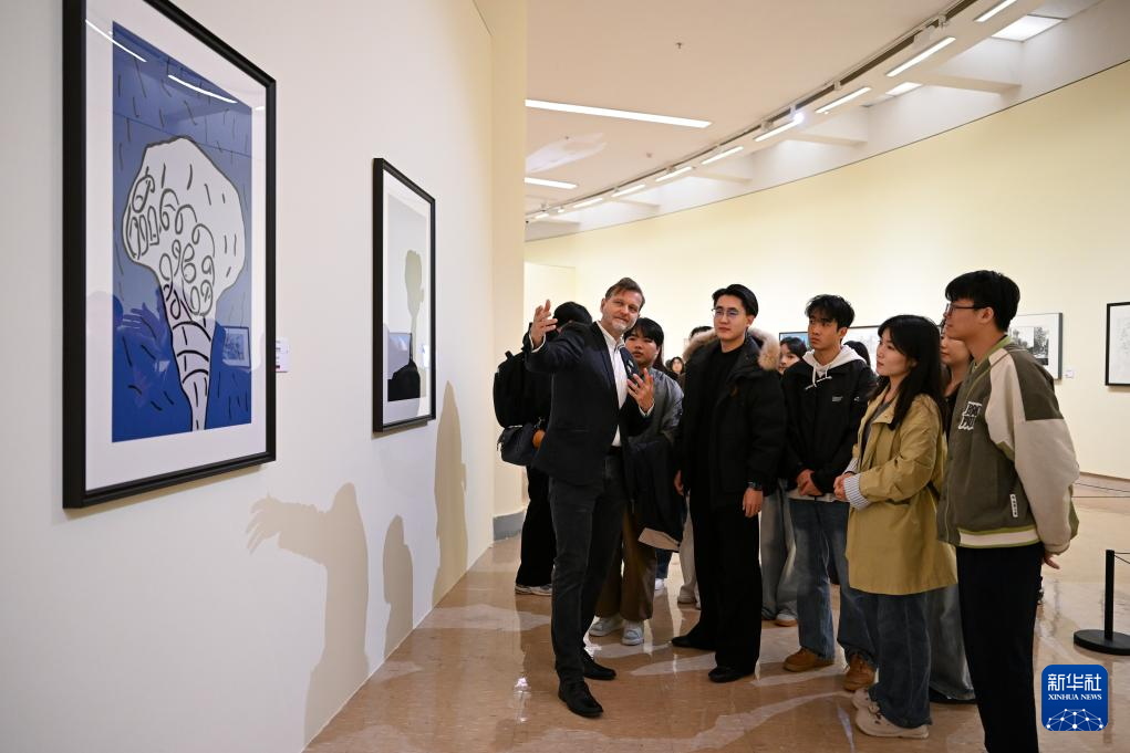 10月19日,參展嘉賓(左一)為參觀者講解藝術作品。