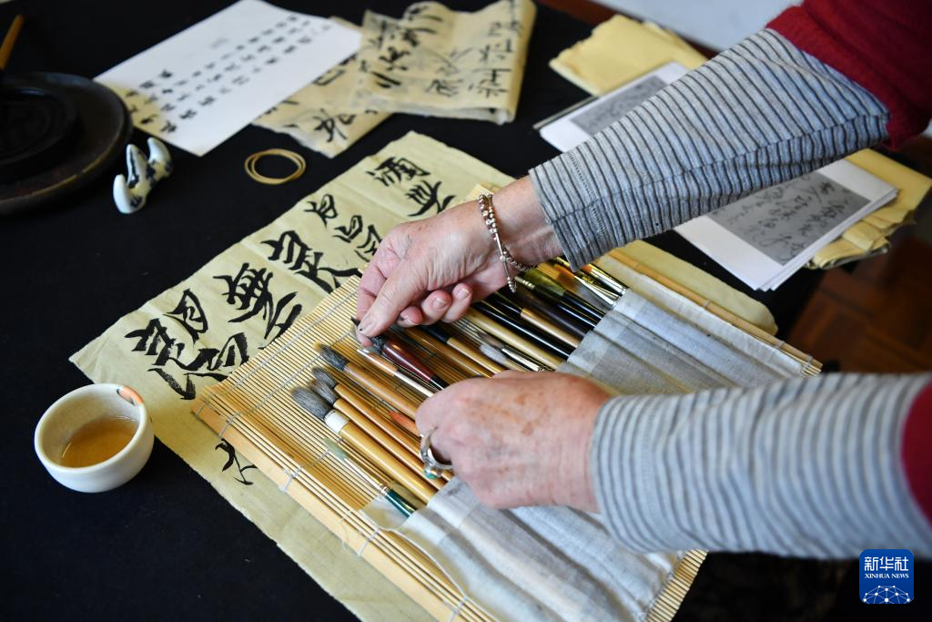 11月19日,在瑞士日內瓦,“樂魚亭”書法工作室的學員整理毛筆。新華社記者 連漪 攝