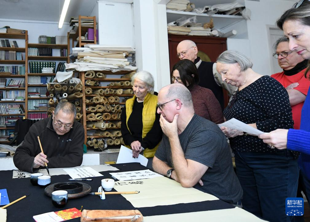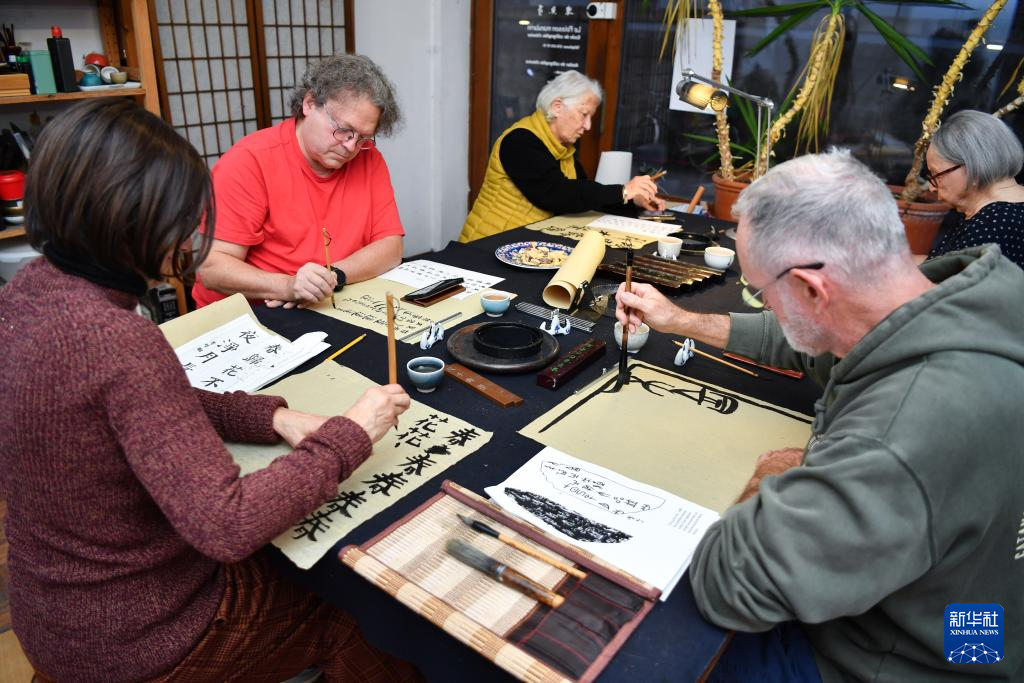 11月19日,在瑞士日內瓦,“樂魚亭”書法工作室的學員觀摩書法老師王飛(左一)寫字。新華社記者 連漪 攝