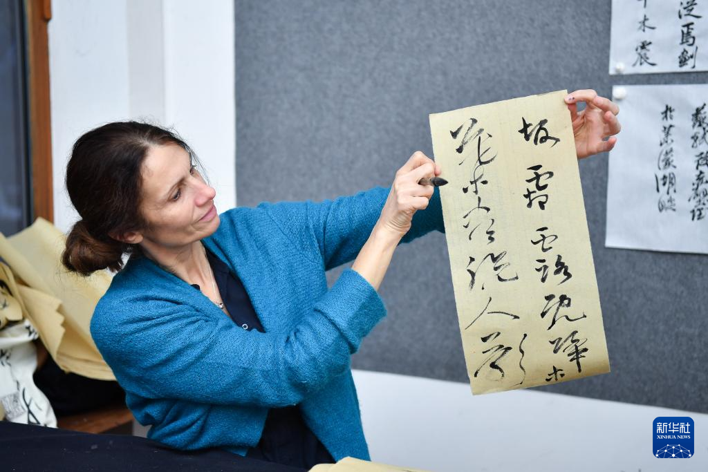 11月19日,在瑞士日內瓦,“樂魚亭”書法工作室學員納迪婭展示她的習作。新華社記者 連漪 攝