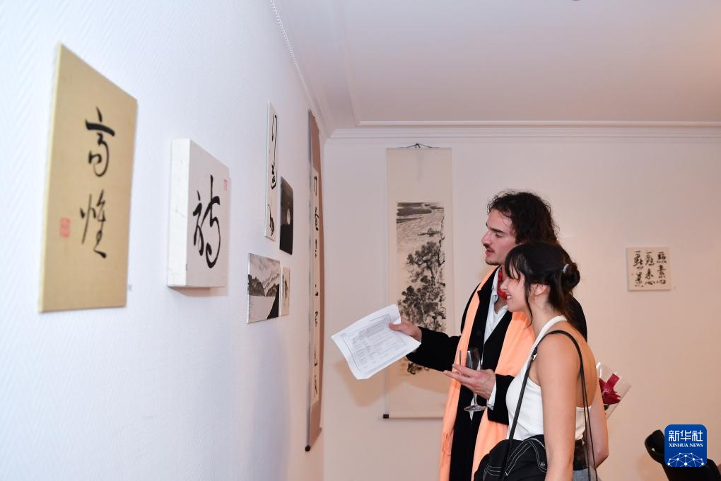 11月20日,在瑞士日內瓦,人們在“金秋”書法展上參觀。新華社記者 連漪 攝