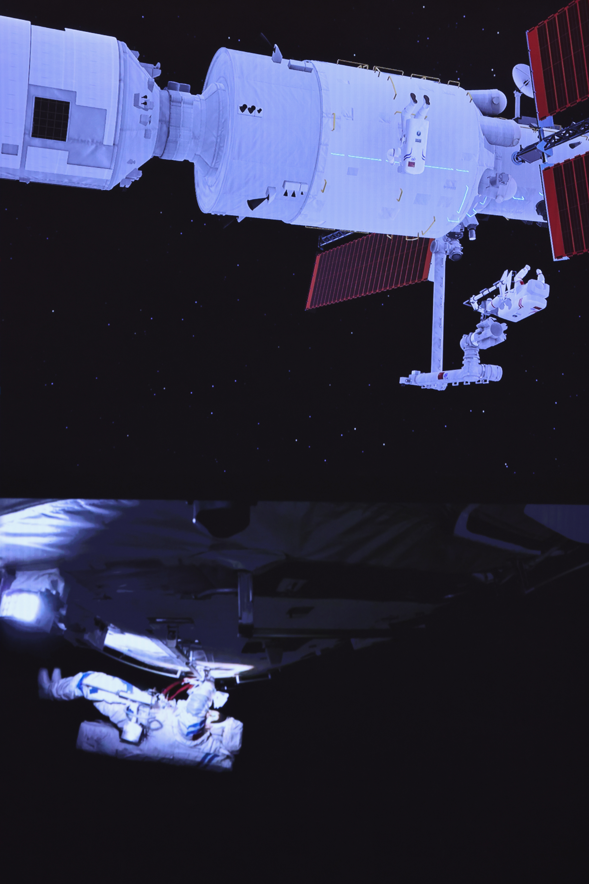 2021年7月4日,在北京航天飛行控制中心大屏拍攝的航天員在艙外工作場面。 新華社記者 金立旺 攝