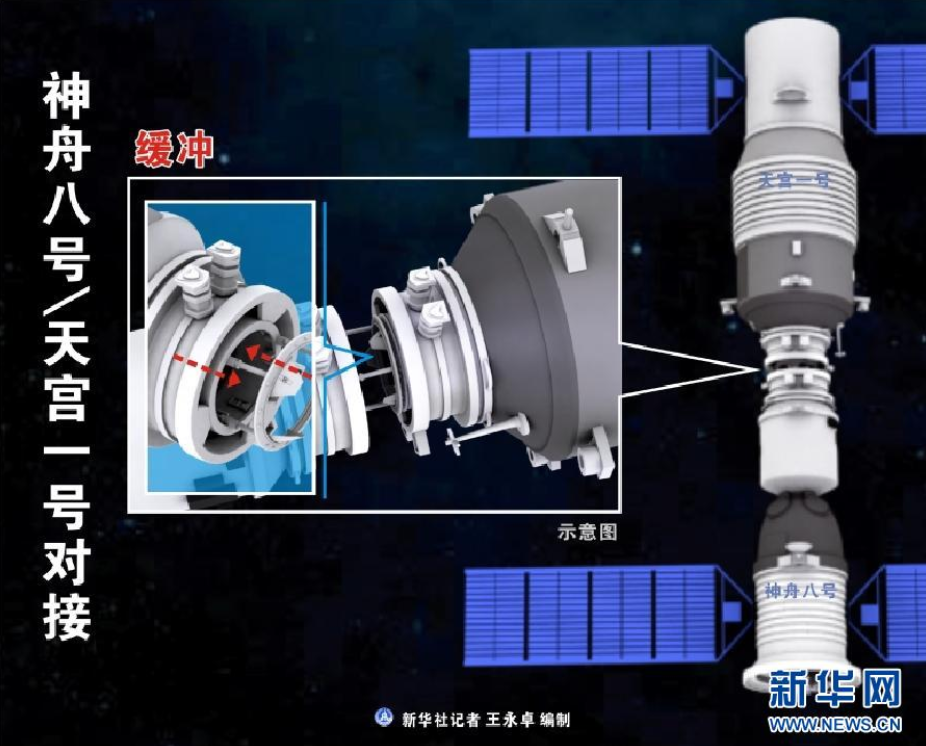 高速飛行的大質量航天器,即使以較小速度相互接觸,沖擊能量也是相當可觀的。飛船和空間站中至少一方需要配置緩沖和耗能裝置,減緩沖擊過載,耗散或吸收撞擊能量。