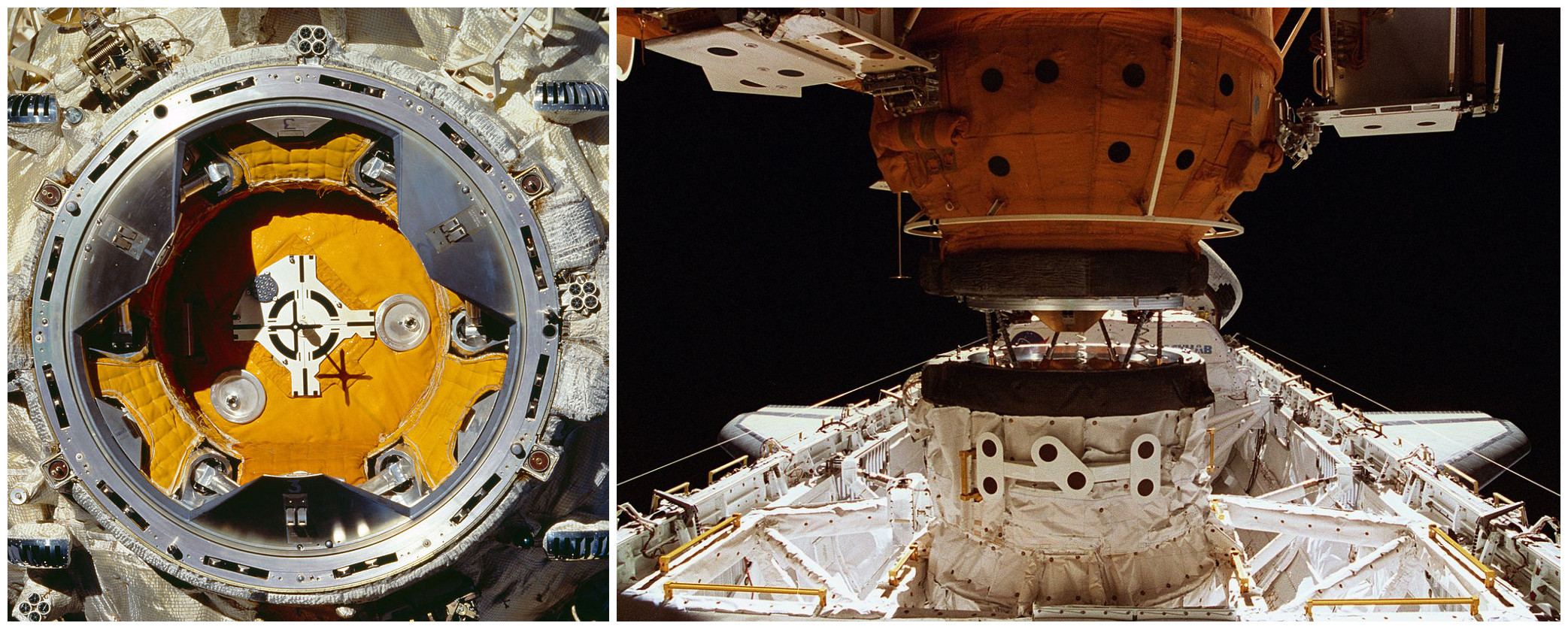 和平號空間站上的APAS-89對接機構及和平號-航天飛機對接。來源:NASA