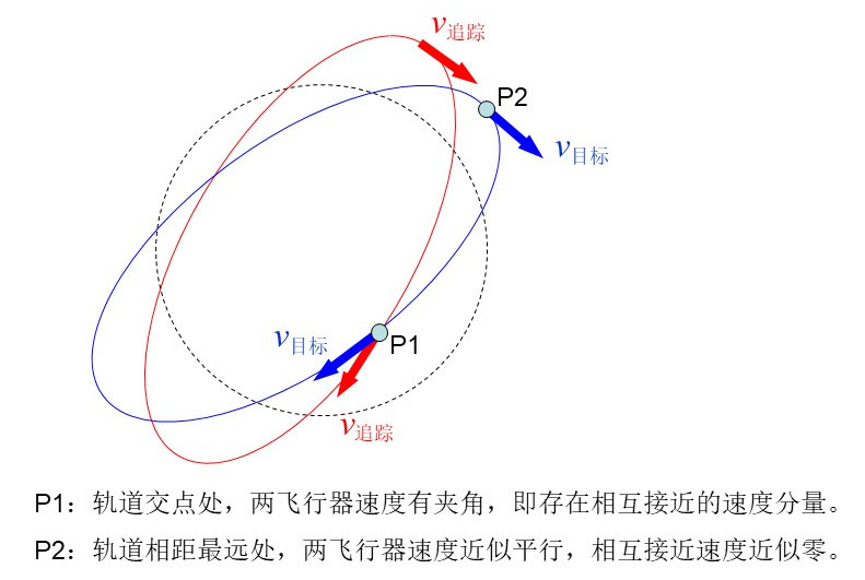 軌道控制在按照以上原則進行規劃、以保證最終的對接精度之外,還要少消耗燃料。因此,變軌道高度盡可能在遠地點、近地點實施,利用霍曼轉移實現能量最優;變軌道面盡可能在軌道交點處實施,通過最高效的控制節省燃料。