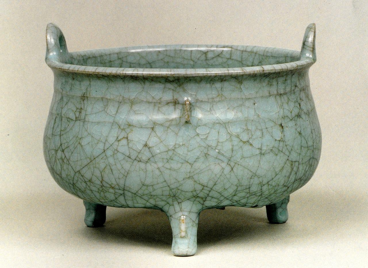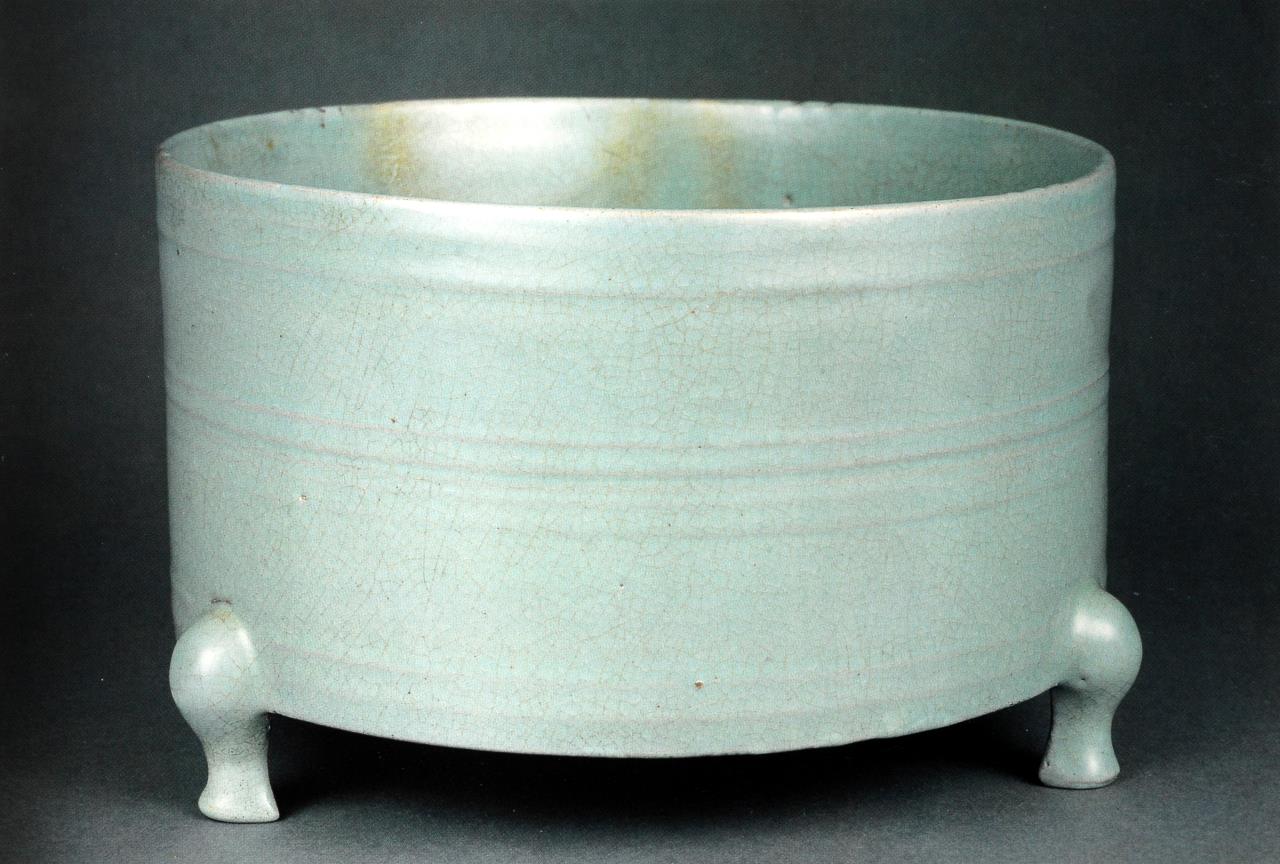 此后,定窯白瓷的入貢被汝窯青瓷取代。汝窯位于今日河南寶豐,其產品以印花和刻花的青瓷為主,主要在北宋晚期承命燒造入貢的器物。入貢的汝瓷以清雋的小型器物居多,胎體細膩,釉色天青,溫潤如玉,造型典雅,有些還模仿古代青銅器。器物絕少施加裝飾,但有細小的開片。