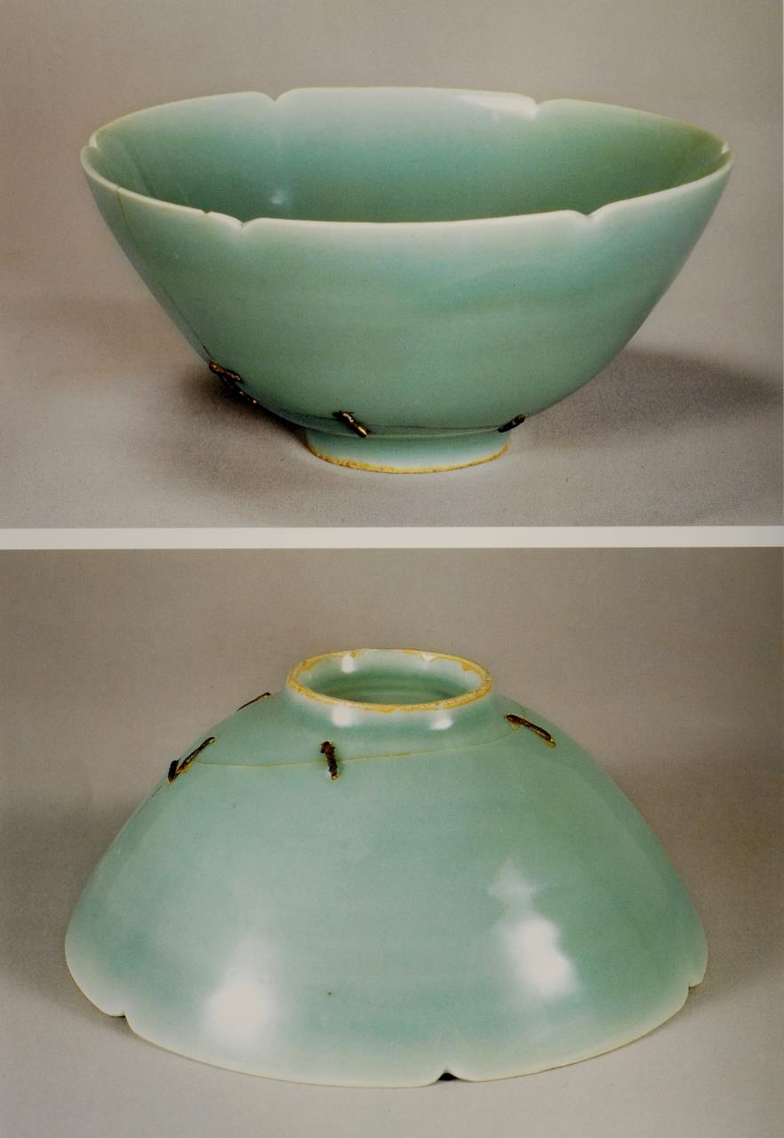 到了北宋中期,碗盤類器物的覆燒方法得以發明。這雖然大大提高了窯爐的裝燒量,但卻導致碗盤的口沿因無釉而顯得毛澀且不便使用。對此,宋人用金、銀、銅的薄片包鑲口沿,以此加以補救。這種手法很古老,兩漢時代稱“釦”,晚唐五代名“稜”。