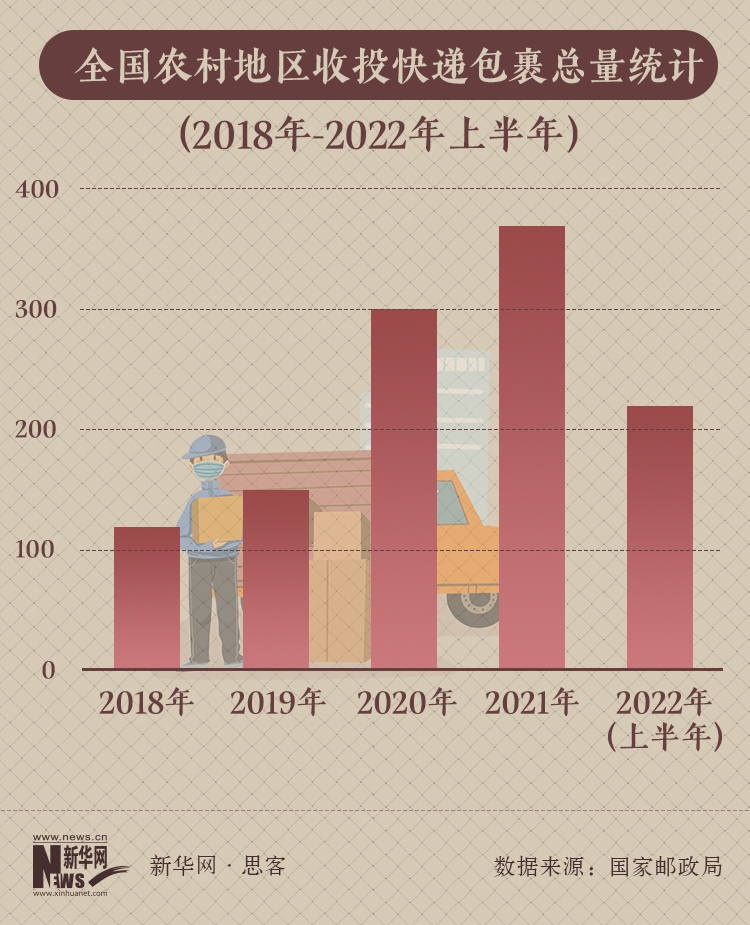 從上圖可以看出,2018年-2021年,全國農村地區快遞包裹收投總量在逐年上升,由2018年的120億件上升到2021年的370億件。龐大的快遞包裹數據背后,是加速推進的“快遞進村”步伐和不斷增強的農村經濟活力,也讓人看到了農村消費市場蘊藏的巨大潛力。