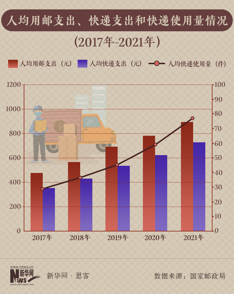 據國家郵政局數據顯示,2017-2021年人均用郵支出、快遞支出和快遞使用量每年都在增長,其中2021年人均快遞使用量為76.7件,年人均用郵支出895.0元,年人均快遞支出731.4元。按照第七次全國人口普查結果14.12億人推測,2021年平均每人每月快遞量超過6個。