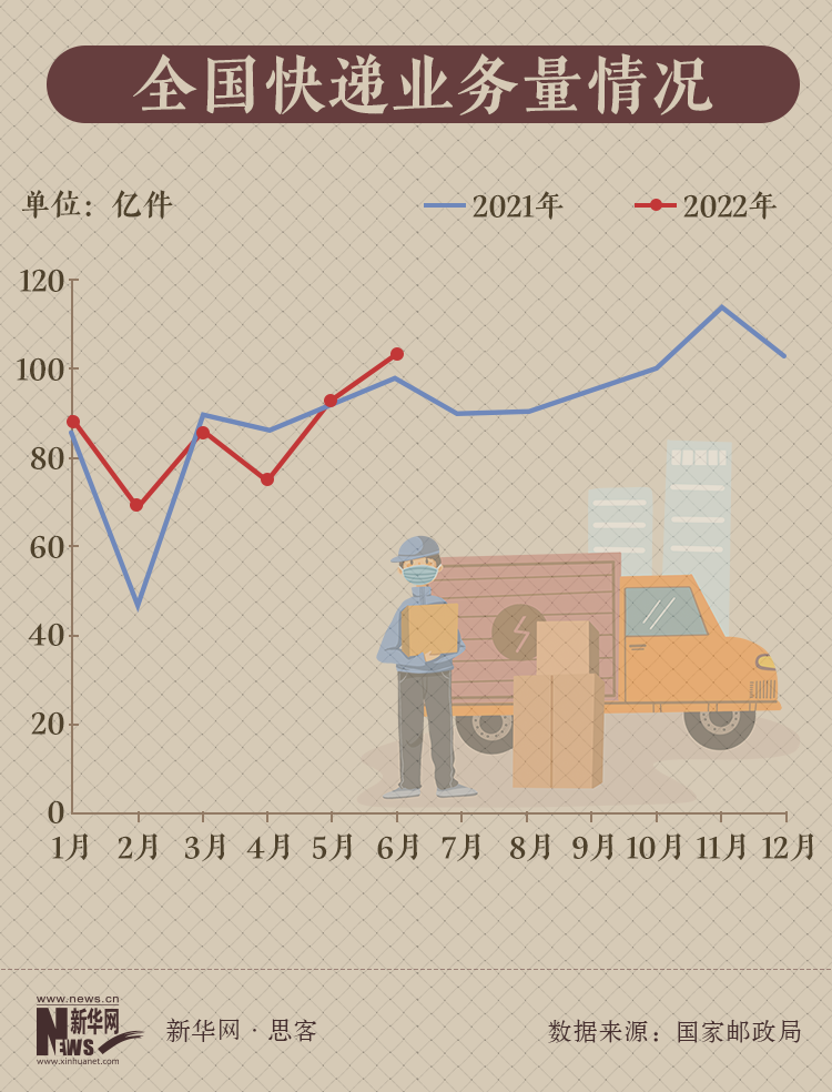 國家郵政局數據顯示,今年上半年全國快遞服務企業業務量累計完成512.2億件。根據國家郵政局此前報告,2021年,全國快遞業務量完成1083億件,首次突破千億件。而目前在疫情影響下,全國半年快遞業務量仍然超過了500億件。