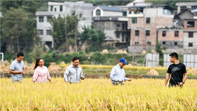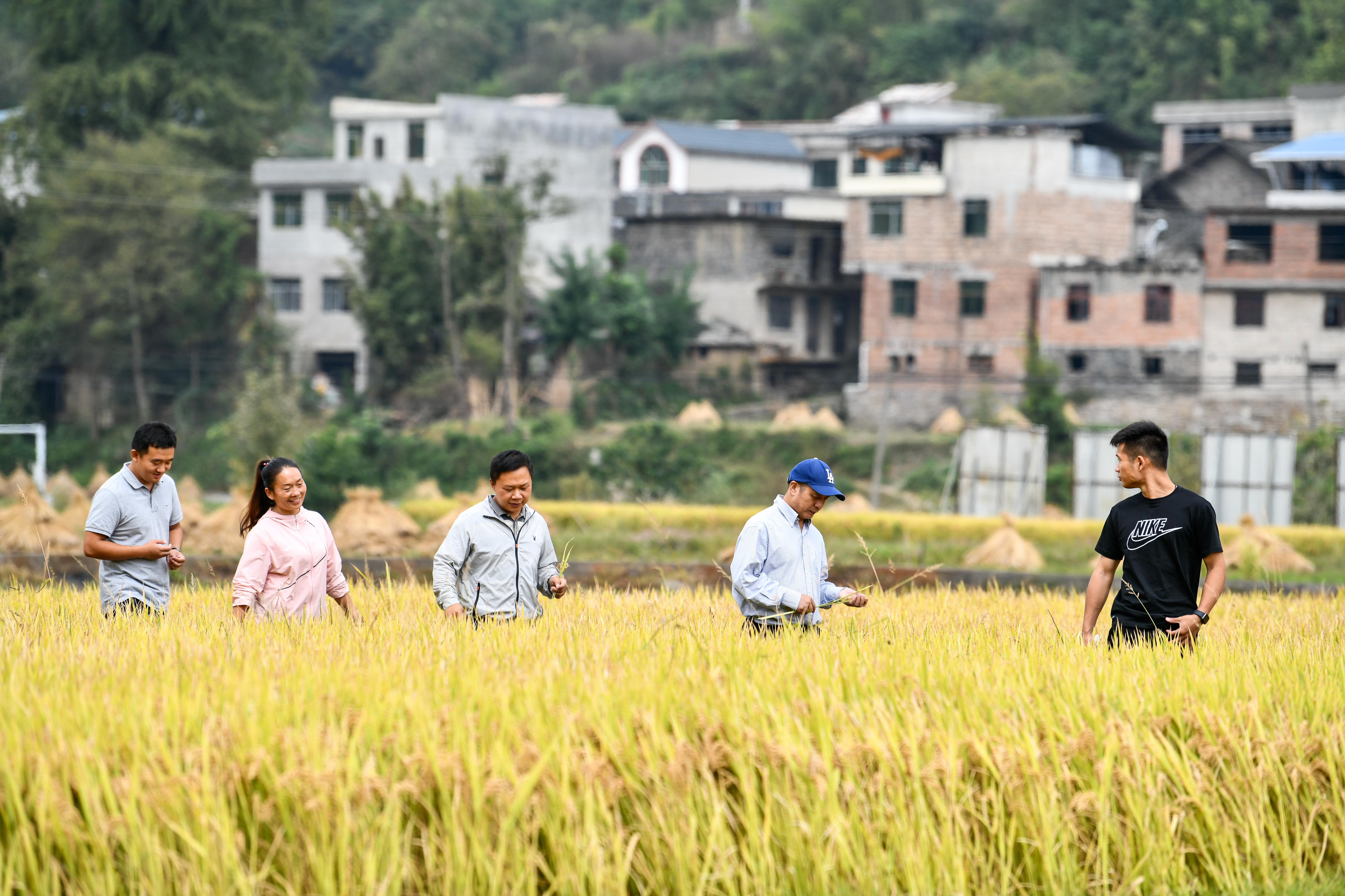 ▲在貴州省麻江縣壩芒鄉樂坪村,新農人和農業專家及隨行學生走在金黃的稻田里。新華社記者 楊文斌 攝