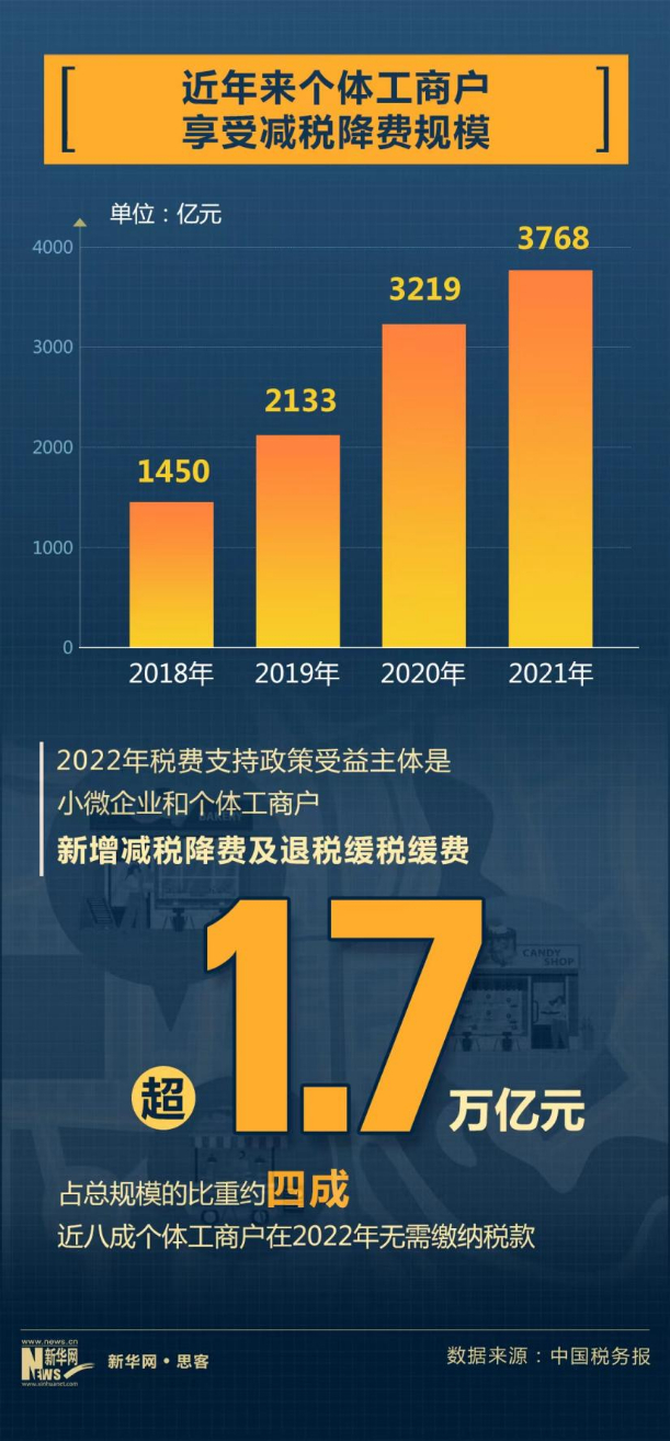 2021年,我國將包括個體工商戶在內的小規模納稅人增值稅免稅月銷售額從10萬元提高到15萬元,對個體工商戶應納稅所得額不超過100萬元的部分,在已有優惠政策的基礎上減半征收個人所得稅。